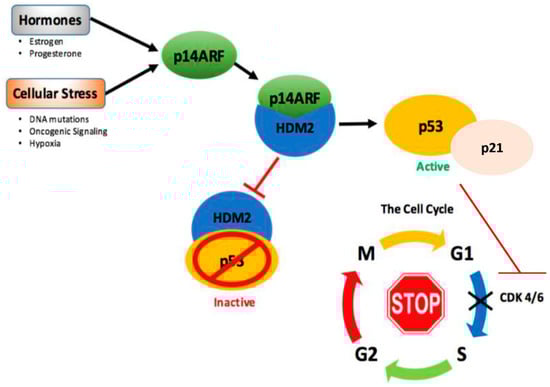 The p14ARF-p53 pathway. HDM2 sustains low basal levels of p53 by its continuous degradation [,]. p14ARF, activated by cellular stress signals and potentially regulated by estrogen and progesterone hormones in the breast [,,,,], causes inhibition of the HDM2–p53 complex, therefore stabilizing p53. p53 is able to bring about cell cycle arrest at the G1/S phase through the activation of the CDK inhibitor p21, which inhibits downstream CDK 4 and 6 [,,]. Both CDK 4 and 6 are well-known mediators of G1/S cell cycle progression, hence their inhibition by p21 halts the cell cycle [].
