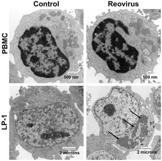 Reovirus (RV) selectively replicates in multiple myeloma cells. Normal peripheral blood mononuclear cells (PBMCs) and LP-1 MM cells were treated with 30 plaque forming units/cell RV for 48 h. RV was detected by electron microscopy. Arrows denote RV.