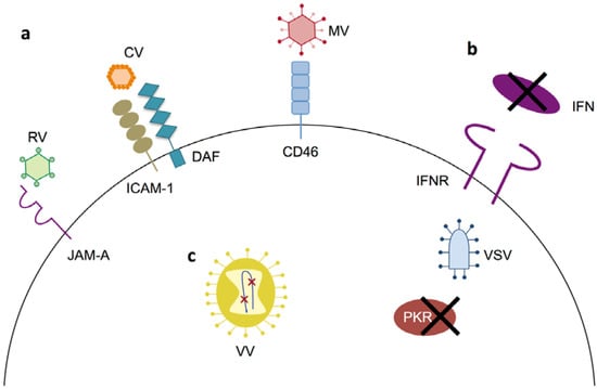Primary mechanisms of tumor specificity for oncolytic virotherapies in multiple myeloma. (a) For RV, CV and MV tumor specificity is dictated by their respective receptors, each of which is overexpressed in MM; (b) Deficiencies in IFN signaling and PKR activity, which are common in MM, provide tumor specificity for VSV; (c) VV tumor specificity is driven by engineered deletions in the vaccinia genome that eliminate genes essential for viral replication in normal cells. Additional mechanisms of tumor specificity exist for many of the viruses depicted; see the text for details.