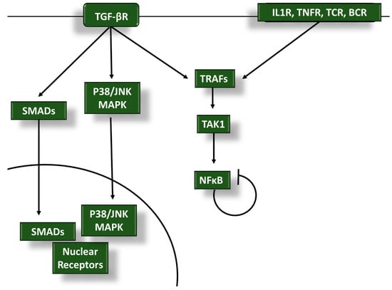 One SMAD-independent pathway that inhibits inflammation is the TGF-β-mediated modulation of TNFR-associated factor (TRAF) and TAK1 signaling, which lies at an intersection with proinflammatory signaling downstream from IL-1R, TNFRs, and TLRs, as well as the TCRs and BCRs (Figure 2). These diverse receptors use TRAF mediators to converge on the activation of TAK1 to stimulate the nuclear factor kappa-light-chain-enhancer of activated B cells (NFκB) and c-Jun N-terminal kinase (JNK)/p38 mitogen-activated protein kinase (MAPK) pathways [43,44,45]. The JNK and p38 stress pathways induce effectors that eliminate the extracellular stress; however, prolonged activation of these pathways can induce apoptosis [44]. The concomitant NFκB activation maintains anti-apoptotic signals until the stress is resolved. TGF-β1, and other TGF-β family members such as BMP, also influence TRAF signaling to alter the activity of TAK1 and downstream NFκB/JNK/p38 signaling [46,47,48] and promote tumor survival and metastasis. TRAF6 activation has been shown to ubiquitinate TGF-βRI and induce cleavage of the intracellular domain of the receptor, which can migrate to the nucleus to induce and interact with transcription factors such as Snail and Slug to promote EMT in cancer cells [49,50]. These transcription factors can further activate TGF-β signaling in breast cancer [51]. NFκB activation downstream from TLR4 can also elevate TGF-β signaling by inhibiting the pseudoreceptor BMP and activin membrane-bound inhibitor (BAMBI) [52,53]. The extensive cross-talk between TGF-β and proinflammatory signaling at the TRAF/TAK1/NFκB axis may be an important target for promoting an effective immune response to tumors.