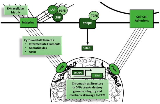 Tensegrity is a structural concept that can be used to understand the mechanics of three-dimensional structures such as cells. Cellular structures are physically connected through cytoskeletal elements, and forces applied to one area can have effects throughout the cell [65,66,67,68,69,93,94,95,96,97]. Forces from the ECM in the tumor microenvironment can have direct impacts on gene expression in tumor and immune cells. These mechanical forces are transmitted through cellular adhesions containing receptors such as integrins, which are one of the primary transducers of mechanical information from the environment to the nucleus [93,95,97,98]. TGF-β can be activated by and alter expression of integrins during cancer progression [99,100,101,102,103]. Integrins and other cell adhesions transduce extracellular forces mechanically to the nucleus via the cytoskeleton (Figure 5). Cytoskeletal elements such as actin, microtubules, and vimentin have all been shown to play a role in TGF-β signaling and cancer [104,105]. Tumor metastasis and proliferation are both altered by TGF-β-mediated cytoskeletal changes [106,107]. The cytoskeleton attaches to the nuclear lamina and chromatin through nuclear membrane adaptor proteins called linker of nucleoskeleton and cytoskeleton (LINC) complexes and KASH (Klarsicht, ANC-1, Syne Homology)-domain proteins [108]. TGF-β signaling and some nuclear lamina proteins have been shown to have reciprocal regulation [109,110,111]. Forces emanating from the extracellular environment are transduced through these structural proteins and can alter the three-dimensional nuclear shape and directly impact gene expression [65,66,68,94,95,96,112,113,114]. TGF-β can influence the structural integrity of each of these sections of the mechanical conduit from the ECM to the nucleus. Additionally, TGF-β influences the structural integrity of chromatin and DNA.