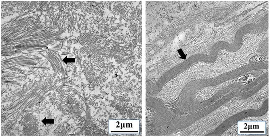 Extracellular matrix (ECM) interactions provide mechanical cues to infiltrating cells. ECM remodeling is required for tumor proliferation, metastasis, angiogenesis, and leukocyte infiltration. The image on the left shows a region with multidirectional bundles of collagen (arrows). The image on the right shows highly organized bundles of parallel collagen fibers found in body (arrow). Dense collagen networks such as these found in capsular regions of lymphoid tissue can be found within the tumor microenvironment. Collagen induced by transforming growth factor β (TGF-β) and other factors provide structural support to cancer cells and a physical barrier to leukocytes. (Transmission electron microscopy images taken by our group.)