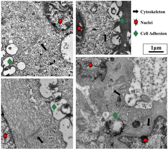 Cell adhesions to other cells and the extracellular matrix (ECM) are mechanically linked to the nucleus. Leukocytes and metastatic tumors often migrate to secondary lymphoid tissues. As seen from the lymphoid tissue images above, cells are intimately connected through several cell–cell adhesions (green diamonds) as they migrate and proliferate in this environment. The four images above show that cell adhesions (green diamonds) are directly linked to the nuclei (red stars) by cytoskeletal elements (black arrows). (Transmission electron microscopy images taken by our group).