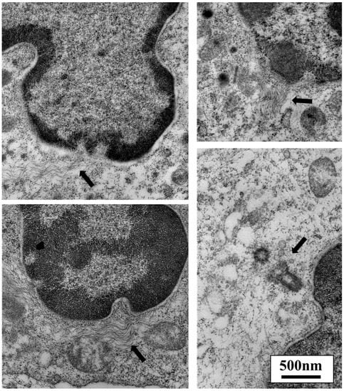 Transmission electron microscopy (TEM) was done on human lymphoid tissue. Routine EM processing was done using intact human tonsillar tissue. The tissue was fixed in 2.5% glutaraldehyde and 1% paraformaldehyde in 0.12 M sodium cacodylate buffer for 20 min at room temperature followed by 40 min of shaking on ice. The tissue was mechanically sectioned into ~1 mm3 tissue chunks. Cells were then stained for 1 h in 1% osmium tetroxide (Electron Microscopy Sciences, Hatfield, PA, USA). The cells were dehydrated through a series of ethyl alcohol/deionized water solutions and propylene oxide before embedding in LR White resin. Blocks were cured for 48 h at 60 °C. Polymerized blocks were trimmed, and 70 nm ultrathin sections were cut with a diamond knife on a Leica Ultramicut EM UC7 (Wetzlar, Germany) before being transferring to 200-mesh copper grids. Sections were counterstained with 1% uranyl acetate for 10 min and lead citrate for 2 min. Samples were imaged with a FEI Talos F200X-TEM (Thermo Fisher Scientific, Waltham, MA, USA) operating at an accelerating voltage of 80 kV equipped with a Ceta 4K × 4K camera.