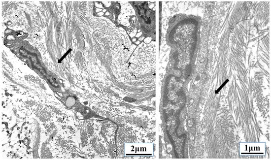 Parallel organization of extracellular matrix (ECM) fibrils can be used as migration tracts. Transforming growth factor β (TGF-β)-induced fibrosis and ECM remodeling during cancer transmits mechanical information from the tumor microenvironment directly to the nucleus of tumor cells, infiltrating leukocytes, fibroblasts, and endothelial cells. Some metastasizing cancer cells use parallel ECM fibrils, called “tumor-associated collagen signatures” (TACSs), similar to the collagen tracts (arrows) used by the leukocytes shown above migrating through lymphoid tissue. (Transmission electron microscopy images taken by our group.)
