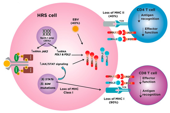 In order to thrive in a lymphocyte-rich microenvironment, HRS cells have developed multiple mechanisms to promote immune tolerance. The most clinically significant mechanism of dampening effector T cell function is by stimulating the programmed death 1 (PD-1)/programmed death ligand 1 (PD-L1) immune checkpoint. PD-L1 expression is variable in cHL patients [44,45], but recent evidence has demonstrated that the level of expression of PD-L1 is associated with the number of copies of the PDL1 gene locus present on chromosome arm 9p24. High-level amplification, present in a third of HL cases, is associated with the highest expression of PD-L1 protein at the cell surface [46]. The 9p24.1 amplification also contains Janus kinase 2 (JAK2) and PDL2, which further upregulates PD-L1 expression, the former through activation of JAK/STAT signaling [46]. Finally, Epstein–Barr virus (EBV), present in HRS in 30–40% of classical HL, can also promote the expression of PD-L1 and PD-L2 [47]. More specifically, EBV induces PD-L1 expression through the activation of the transcription factor pathway AP1 and downstream upregulation of c-Jun and JunB, a hallmark pathway of classical HL, irrespective of 9p24.1 copy numbers [48,49]. In addition to hijacking the immune checkpoint system, HRS cells have also evolved other mechanisms to evade immune surveillance. Recent evidence is emerging that highlights a lack of β2-microglobulin (B2M) and Major Histocompatibility Complex (MHC) class I at the HRS cell surface in ~90% of cHL cases, which is an essential requirement for an effective CD8+ T cell cytotoxic response [50,51,52]. Furthermore, MHC class II is not expressed on the surface of HRS in ~40% of cHL cases, which is critical for antigen presentation to CD4+ helper T cells [53]. Taken together, HRS cells have adapted multiple mechanisms to evade immune surveillance and thrive in an immune rich milieu (Figure 1).