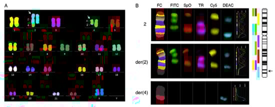 Multi-color Fluorescence in Situ Hybridization (FISH). (A) 24-color karyotyping revealed the translocation t(2;4). White arrows indicate the derivative chromosomes. (B) mBanding analysis of chromosomes 2. The single-color gallery tool in ISIS software shows assigned false colors (FC) and individual color schemes of labeled chromosomes arranged in their capture sequence FITC (fluorescein isothiocyanate), SpO (spectrum orange), TR (Texas red), Cy5 (cyanine), DEAC (7-diethylaminocoumarin-3-carboxylic acid, succinimidyl ester). Upper row shows the normal chromosome 2, middle row shows the der(2)t(2;4) and lower row show the der(4)t(2;4) from the patient’s karyotype. The right-hand side shows a schematic representation of the localization of the different multicolor probes of XCyte 2 relative to the ideogram of chromosome 2 together with breakpoint marked by the arrow.