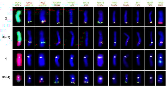 To establish the breakpoint region on chromosomes 2 and 4 more precisely we used a panel of BAC-based probes in different combinations (Table 2 and Figure 3). From these FISH analyses we were able to determine that the breakpoint region on chromosome 2 is located within the BAC-probe RP11-79C2 and on chromosome 4 within the BAC-probe RP11-13F20.