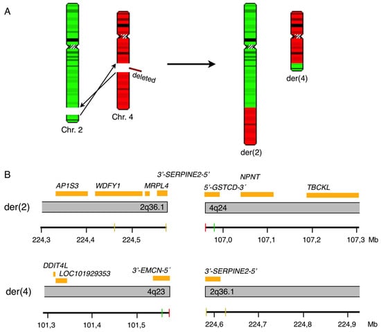 In silico analysis of the involved regions suggested that the 5′-part of EMCN gene (spanning exons 1 to 5) at 4q23 and the 5′-part of GSTCD gene (spanning exons 1 to 5) at 4q24 were deleted (Figure 4B). The fusion of the chromosomal regions 4q23 and 2q36.1 on der(4)t(2;4) could theoretically form the fusion gene SERPINE-EMCN. The fusion on der(2)t(2;4) involved the 5′-part of the GSTCD gene on 4q24, but it could not be determined which of the WDFY1, MRPL4 or SERPINE genes on 2q36.1 that might be involved in the translocation event due to lack of genomic resolution. Unfortunately, we could not perform gene expression or RNA sequencing analyses to establish possible presence of a fusion gene or altered expression of involved genes due to lack of additional sample material.