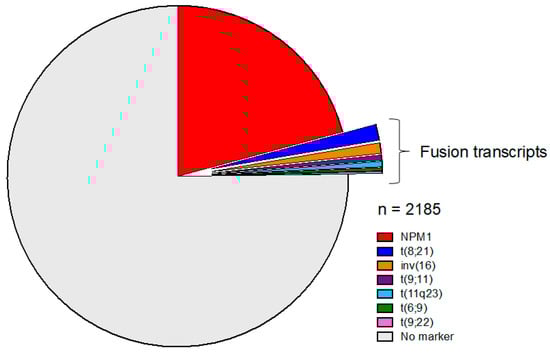 - Eisfeld, A.-K.; Mrózek, K.; Kohlschmidt, J.; Nicolet, D.; Orwick, S.; Walker, C.J.; Kroll, K.W.; Blachly, J.S.; Carroll, A.J.; Kolitz, J.E.; et al. The mutational oncoprint of recurrent cytogenetic abnormalities in adult patients with de novo acute myeloid leukemia. Leukemia 2017, 31, 2211–2218. [Google Scholar] [CrossRef] [PubMed]