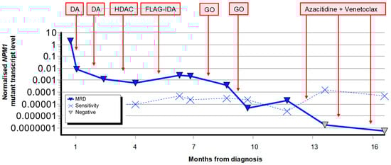 - Schnittger, S.; Kern, W.; Tschulik, C.; Weiss, T.; Dicker, F.; Falini, B.; Haferlach, C.; Haferlach, T. Minimal residual disease levels assessed by NPM1 mutation-specific RQ-PCR provide important prognostic information in AML. Blood 2009, 114, 2220–2231. [Google Scholar] [CrossRef] [PubMed]