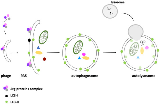 Schematic representation of autophagosome formation. The activation of the ATG (AuTophaGy-related) complex induces the formation of a pre-autophagosomal structure (PAS). The recruitment of proteins and lipids induces membrane expansion and then its closure to form the autophagosome, enveloping proteins and organelles destined for degradation. An important step in the PAS elongation is the recruitment of the protein light chain 3 (LC3), an important marker of autophagic flux. After induction of autophagy, LC3 is cleaved and turned into its activated form, LC3-I. When recruited to the autophagosome, LC3-I is converted to its lipidated form LC3-II, that can bind on both the inner and outer surface of the autophagosome. In the final stage, the autophagosome merges with the lysosome, and the cargo is completely degraded.