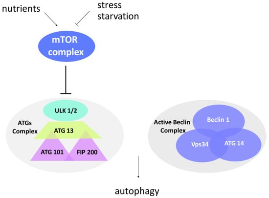 To avoid indiscriminate degradation, autophagy is subjected to a stringent spatiotemporal regulation. This is secured by the activity of multiprotein complexes activated only in presence of the aforementioned inputs. Nutrient-sensing pathways, growth factor signaling, and oxidative and general stress responses converge on an evolutionarily conserved protein kinase known as TOR (Target of Rapamycin) [31], placed at the crossroads between normal metabolism and autophagy. The TOR kinase, through the interaction with its binding partners, forms two complexes called mammalian TOR (mTOR) complex1 and mTOR complex2, depending on the cell and tissue types. Excess radicals or absence of nutrients inhibit mTOR complex (mTORC) kinase activity, and cell metabolism is thus switched to autophagy (Figure 2).