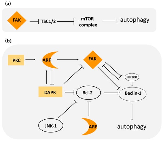 Pathways of focal adhesion kinase (FAK) and alternate reading frame (ARF) mediated regulation of autophagy. (a) FAK can induce activation of the mTOR complex by blocking tuberous sclerosis complex (TSC)1/2. (b) FAK can block the activation of the Beclin-1 complex by sequestering FIP200 or through direct phosphorylation of Beclin-1. Bcl-2/Bcl- XL sequester Beclin-1, inducing autophagy inhibition. ARF can either activate FAK or block Bcl family members. In light-orange boxes are represented proteins (protein kinase C (PKC) and death-associated protein kinase (DAPK)) that positively regulate ARF stability. DAPK can promote autophagy by blocking Bcl2 and inducing the Beclin-1 complex.