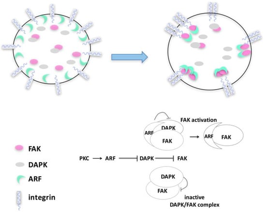 It has been shown that FAK activation can be counteracted by DAP kinase expression by disrupting signal transduction between integrin and FAK upon ECM interaction [85,86,87]. In line with this, p14ARF expression prevents DAPK-mediated FAK degradation [21]. During cell spreading, a complex composed of DAPK, FAK, and p14ARF can be detectable (Figure 4). Our data led us to conceive a model in which, during cytoskeleton remodeling, p14ARF protein levels increase in the cytoplasm thanks to PKC-mediated stabilization. In this time window, DAPK would interact with FAK, preventing its improper activation. The increase of ARF protein levels gradually interferes with this mechanism, hampering DAPK-mediated inhibition of FAK (Figure 4), maybe by competing with DAPK in FAK binding. This is associated with an increased proliferation rate mirroring increased FAK phosphorylation. Insights within the molecular mechanism at the basis of ARF/FAK functional interaction come from the observation that the ARF protein domain required for both pFAK stabilization and cell survival is located in a specific region in the C-terminal of the protein. Interestingly, this domain plays an established role in autophagy [46], as previously described, suggesting that ARF’s ability to regulate autophagy could be involved in this mechanism.