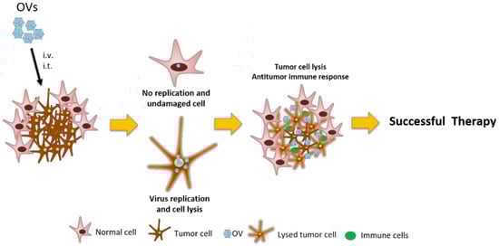 Mechanism of antitumoral effect of oncolytic viruses (OVs). The administration of OVs could be intravenous or intratumoral. Once the virus reaches the tumor is able to infect both normal and tumor cells but only replicates and lyses the tumor cells. Besides the potent cytolytic effect of the virus, the generation of an antitumor immune response is crucial to the complete eradication of the tumor.