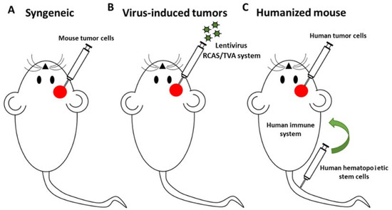 In order to improve the antitumor immunity and overcome the antiviral immune response, many OVs armed with immunostimulatory molecules including cytokines (GM-CSF, IL-12, IFNγ), co-stimulatory ligands (OX40L, 4-1BBL), checkpoint inhibitors (anti-PD-1, anti-CTLA4) and even the combination of two molecules have been evaluated with promising results [103,104,105]. The major challenge to evaluate the efficacy and safety of this new generation of OVs in many types of tumors, including PBTs, is the limited immunocompetent models available for the experimentation. In this sense, a big effort has been done to generate immunocompetent transgenic mouse models of different cancers (Figure 2). The classic approach is the use of the syngeneic mouse models which consist in the engraftement of a murine cancer cell line into the same inbred immunocompetent mouse strain (Figure 2A). The main limitation is the lack of murine cancer cell lines representative of the tumors observed in humans and specifically PBTs. One of the novel approaches recently reported is the induction of spontaneous tumors using viral vectors to introduce specific mutations characteristic of human cancers (Figure 2B). Misuraca et al. used the RCAS/Tv-a system to develop a mouse model of pediatric brain stem glioma with the characteristic mutation H3.3K27M to investigate the molecular basis of this disease and novel therapeutic strategies [106]. Moreover, in order to study immunomodulatory therapies in adult gliomas, Marumoto et al. developed an immunocompetent mouse model of glioblastoma by injecting Cre-loxP–controlled lentiviral vectors expressing mutated Harvey Ras and AKT proteins [107]. Humanized mice models engrafted with human hematopoietic stem cells that develop into functional human immune systems have also became an important pre-clinical tool with potential uses in the evaluation of OVs in PBTs (Figure 2C) [108]. All these experimental approaches open exciting possibilities for the pre-clinical evaluation of many OVs required for the subsequent translation to clinic in order to overcome many fatal pediatric cancers.