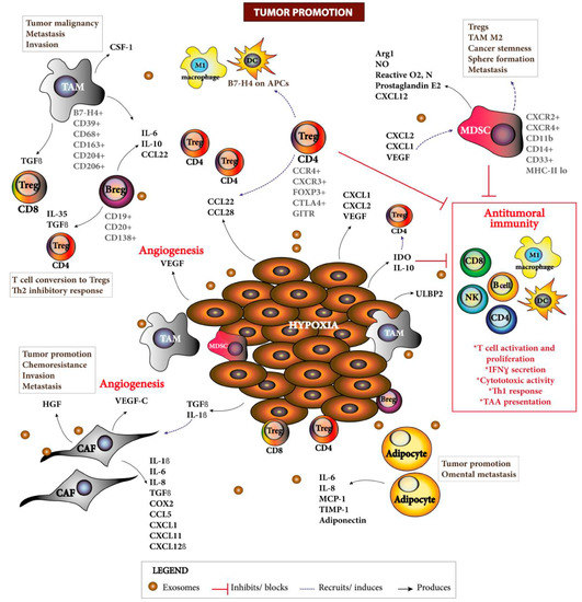 Overall, Tregs are considered a critical barrier against antitumoral responses along with tolerance-inducing plasmacytoid DCs, B7-H4+ TAMs, MDSCs, IL-10, TGFβ, and VEGF. All these processes act in concert as a tumor evasion mechanism resulting in tumor progression [145]. Barriers to antitumoral responses are summarized in Figure 2.