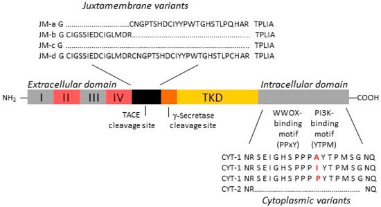 Like EGFR, ERBB4 is a transmembrane receptor tyrosine kinase (RTK), with a ligand-binding extracellular domain and an intracellular catalytic kinase domain [18]. Alternative RNA splicing can result in six variants: Tumor necrosis factor-alpha converting enzyme (TACE)-cleavable extracellular domains (JM-a, JM-d), non-cleavable extracellular domains (JM-b, JM-c) and intracellular domains (CYT-1, CYT-2) (Figure 1). These variants are expressed in a tissue-specific manner, with JM-b predominating in the brain, particularly the cerebellum [19]. In medulloblastoma, all ERBB4 variants are expressed, with JM-a [16] and CYT-1 [20] predominating.
