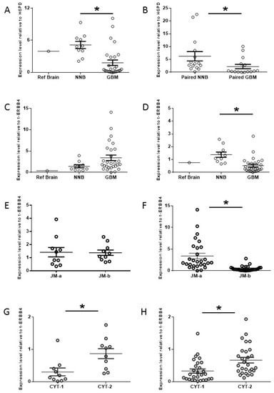 Total ERBB4 and ERBB4 variant expression. ERBB4 expression in 10 non-neoplastic normal brain (NNB), 28 glioblastoma (GBM), and 15 paired NNB and GBM samples. Expression levels were determined by RT-qPCR; total ERBB4 levels were standardized to H6PD mRNA, and variant levels were standardized to total ERBB4 mRNA levels. All measurements were made simultaneously but are displayed separately to aid comparison. Reference brain (Ref Brain) was a pooled brain sample from 7 donors (Ambion, Thermo-Fisher, Waltham, MA, USA) used for comparison. Total ERBB4 mRNA expression in Ref Brain, NNB and GBM samples (A). Total ERBB4 mRNA expression in paired NNB and GBM samples (B). Expression of JM-a (C) and JM-b (D) variants of ERBB4 in Ref Brain, NNB and GBM samples. Comparison of JM-a and JM-b expression levels in NNB (E) and GBM (F). (Note that the data shown in (E,F) are rescaled from (C) and (D).) CYT-1 and CYT-2 expression levels in NNB (G) and GBM (H). Experiments were performed in triplicate (* p < 0.05, Student’s t-test).
