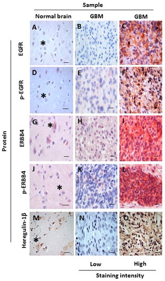 Representative IHC images of occipital regions in an NNB sample and a GBM sample. Samples were stained for EGFR (A–C), p-EGFR (D–F), ERBB4 (G–I), p-ERBB4 (J–L) and heregulin-1β protein (M–O). Images are representative of high and low staining intensity of ERBB proteins (stained with VECTOR® Red Alkaline Phosphatase (red), Burlingame, CA, USA) and of heregulin-1β protein (stained with 3,3′-Diaminobenzidine (DAB) (brown); nuclei were counterstained with hematoxylin (blue). Asterisks denote neurons. Scale bars, 25 µm.