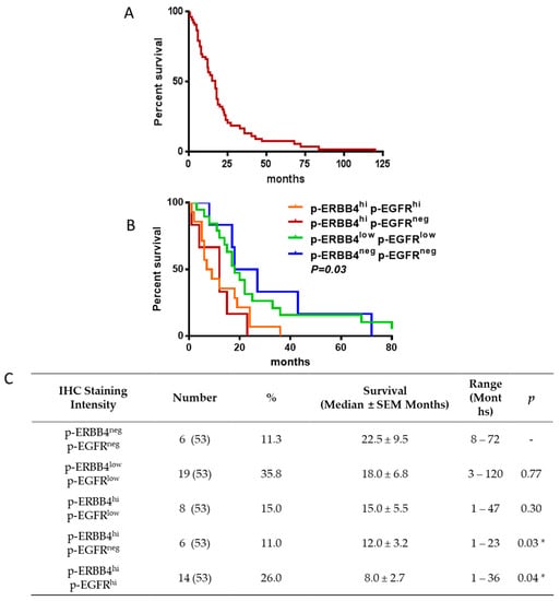 Comparative survival of patients with GBM. The overall survival for the 53 patients with GBM for whom survival data were available ranged from 1 to 120 months (A). Graphical (B) and tabulated (C) survival outcomes associated with patient samples with high (hi), low (low) and no (neg) p-ERBB4 or p-EGFR staining by IHC. Combinations not shown in the table were not identified. (* p < 0.05 vs. p-ERBB4neg p-EGFRneg samples, Student’s t-test).