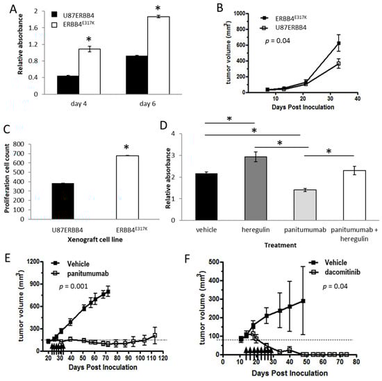Activated ERBB4 and cell growth potential. The proliferation of U87MG cells infected with retrovirus carrying wild-type ERBB4 (U87ERBB4) was compared with hyper-activated ERBB4-expressing cells (ERBB4E317K) in vitro using an MTS proliferation assay at day 4 and 6 following drug addition (A), in vivo using xenograft tumor growth measured over time (B) and ex vivo using IHC analysis of Ki67 staining (C). MTS proliferation assay of SF767 cells treated with heregulin-1β (40 ng/mL), panitumumab (10 µg/mL) or both (D). Tumor volumes of SF767 xenografts treated with panitumumab (E) or dacomitinib (F). Arrows denote treatment times. Bars indicate mean values ± SEM (n = 4). Asterisks indicate bars that are significantly different from each other (* p < 0.05, Student’s t-test). All in vitro experiments were performed in triplicate. The in vivo tumor data include six repeats per group.
