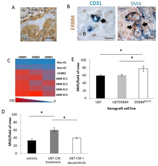 Angiogenic role of ERBB4. (A,B) p-ERBB4 expression on the vasculature of the GBM glomeruloid structure identified with DAB (brown), with nuclei counterstained with hematoxylin (A). IHC double stains demonstrated p-ERBB4 (brown) expression on endothelial cells (CD31, blue) and on pericytes (SMA, blue) in GBM patient samples (B). All IHC was performed on four biological replicates. Arrows point to pericytes, and asterisks identify endothelial cells. Scale bars, 25 µm. (C) Heat map of ERBB4, ERBB3 and ERBB2 mRNA expression of endothelial cells isolated from four samples of GBM (GBM-EC), one normal brain endothelial cell line (HCMEC) and two non-endothelial cell lines (non-EC), as measured by RT-qPCR. RT-qPCR was performed on triplicate samples. (D,E) MVD counts from subcutaneous agar plugs containing U87MG conditioned medium (U87-CM) following treatment with dacomitinib (D); representative images are shown in Figure S9A. MVD counts for U87MG, U87ERBB4 and ERBB4E317K xenografts (E); representative images are shown in Figure S9B. Bars indicate mean values ± SEM (n = 4). Asterisks indicate bars that are significantly different from each other (p < 0.05, one-way ANOVA).