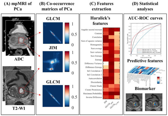 The most recent studies of non-invasive MRI-based techniques have implemented radiomics analysis to further increase our ability to prognosticate PCa [18,21,22,23,24]. Radiomics analysis is an approach that incorporates various radiological features, namely texture and shape characteristics/features, to predict biological characteristics. An increasingly implemented radiomic feature is gray level co-occurrence matrices (GLCM) [25]. GLCM encodes the texture of a region of interest (ROI) and measures the heterogeneity within it. Clinically, the ROI is typically suspicious for malignancy. At a technical level, these texture features are computed from each of MRI sequence then used as an input of the classifier model to predict for or prognosticate a PCa [23].