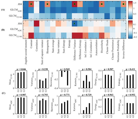 Spearman’s rank correlation between texture features and GS groupings showed a low correlation value and a maximum absolute value of 0.23. The difference variance feature, derived from the JIM, showed a negative correlation value of 0.23 with a corrected p < 0.05 (Figure 2B).