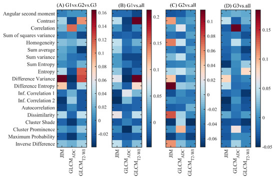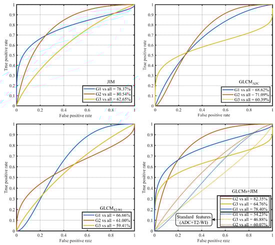 In Figure 3, AUCs based on JIM features had a value of 78.37% for G1, 80.54% for G2, and 62.65% for G3, while the conventional GLCM features had AUC values of 68.62%, 71.09%, and 60.39%. For the GLCM features derived from ADC and T2-WI, the AUC values were 66.66%, 61.00%, and 59.41% for G1, G2, and G3, respectively.
