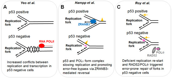 Using such an assay, three independent manuscripts have reported a potentially direct contribution of p53 (transcription independent) to the replication of DNA. Different cell lines and DNA damaging agents were used and results are not completely overlapping. Differences may result from the impact that p53 has on the choice of different DNA replication-auxiliary processes triggered by dissimilar types of DNA barriers on replication templates. By controlling such a choice, p53 improves the quality of DNA replication in terms of: (a) the selection of error-free pathways or (b) the coupling between DNA replication and other frequent DNA-associated transactions such as transcription (see Figure 2 and detailed explanation below).