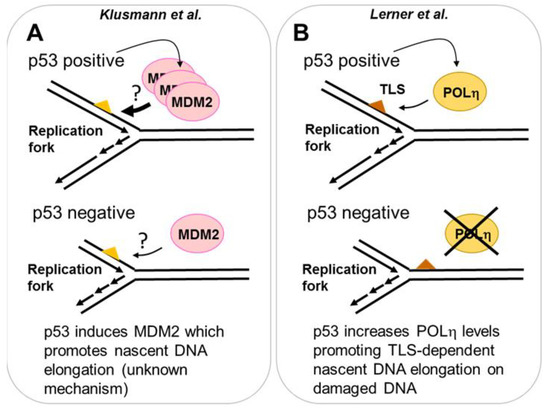 p53 can induce hundreds of targets that promote cell cycle arrest and cell death and many other outcomes relevant for its antioncogenic function [50]. It is therefore valid to examine whether the contribution of p53 to DNA replication can also be mediated by p53 targets. More than a decade ago, a role of the p53 target, the cyclin kinase inhibitor p21 in the regulation of the ubiquitination of PCNA was reported [21,51]. Such a post-transcriptional modification of PCNA promotes DNA damage tolerance events across DNA damage [52]. In particular, damage tolerance by translesion DNA synthesis promotes the loading of specialized DNA polymerases to the replisome. Such DNA polymerases aid DNA synthesis across damaged DNA, which are poor templates for replicative DNA polymerases [26]. In addition to the cyclin kinase binding domain, p21 has a strong PCNA binding domain that is critical for displacing specialized DNA polymerases from PCNA [53]. When DNA templates are damaged by UV irradiation, p21 must be removed from replication forks to promote their TLS-dependent progression [54]. Hence, on damaged DNA templates, p21 is a negative regulator of nascent DNA elongation. However, under unperturbed replication conditions, p21 is required at active forks to promote nascent DNA elongation. In that case, p21 prevents the dysregulated loading of specialized POLκ to undamaged DNA. If POLκ is recruited to undamaged templates it reduces replication speed as a consequence of its low processivity [55]. Hence, on undamaged DNA, p21 protects DNA replication elongation, preventing inefficient elongation by specialized DNA polymerases. It should also be mentioned that after the initial submission of this review a manuscript indicating that p21 also prevents nascent DNA elongation in cells treated with yet another source of DNA damage, PARP inhibitors, was published [56], an observation that is in agreement with a previous study [54]. However, in contrast to another previous study [55], the authors found a negative effect of p21 on the elongation of undamaged DNA [56]. While more work will be required to determine the nature of such contradictory results, it is clear that p21 is a key regulator of replication speed. Furthermore, the regulation of DNA replication by p21 is not limited to a direct control of the replisome. p21 overexpression (in tumor cells expressing mutant p53) alters origin firing and increases replication stress in a manner that depends on the reduced availability of replisome regulators such as the CRL4-CDT2 ubiquitin ligase [57]. Hence p53 and p21 are important regulators of the DNA replication choreography. In addition to p21 other two p53 targets, MDM2 and the specialized POLη, also contribute to DNA replication (see Figure 3 and detailed explanation below).