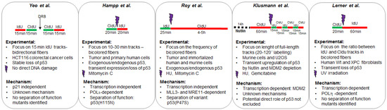 Different protocols used to explore the effect of p53 on DNA replication. The experimental design of each study is illustrated in the upper part of each panel. Other experimental settings are detailed in the mid-section. Mechanistic insights collected in each study are detailed in the bottom part of each panel.