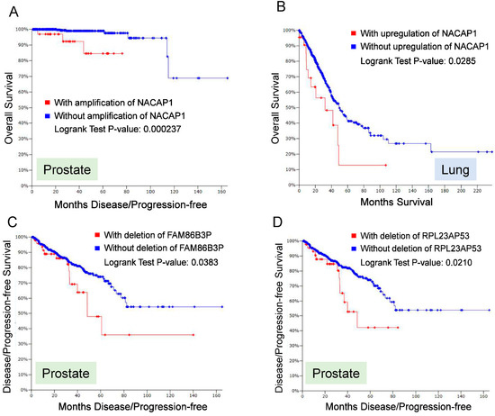 Of interest, these alterations (amplification or deletion) in some pseudogenes was associated with poor prognosis (Figure 3). Among those four pseudogenes, amplification of NACAP1 was associated with overall survival in prostate cancer (Figure 3A); upregulation of NACAP1 was associated with overall survival in lung cancer (Figure 3B). In addition, deletion of FAM86B3P and RPL23AP53 was associated with disease-free survival in prostate cancer (Figure 3C,D). These results suggest that alterations of pseudogenes occur broadly in various types of cancer, and they may serve as diagnostic or prognostic markers, further highlighting the clinical significance of pseudogenes.