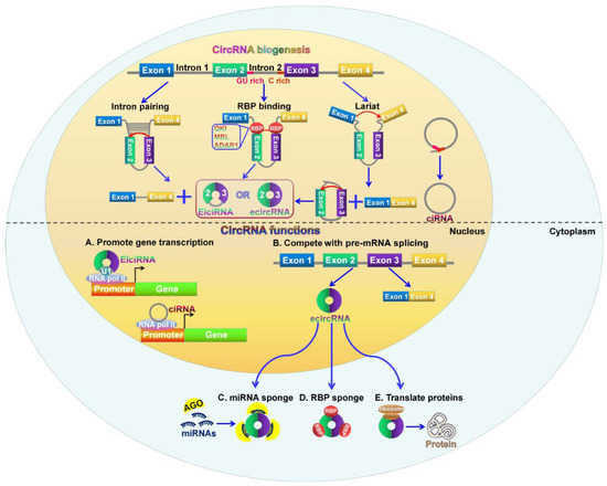 - Li, Z.; Huang, C.; Bao, C.; Chen, L.; Lin, M.; Wang, X.; Zhong, G.; Yu, B.; Hu, W.; Dai, L.; et al. Exon-intron circular RNAs regulate transcription in the nucleus. Nat. Struct. Mol. Biol. 2015, 22, 256–264. [Google Scholar] [CrossRef] [PubMed]