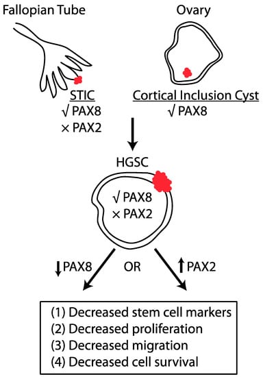PAX2 and PAX8 regulate tumor formation in HGSC in an opposing manner. Serous tubal intraepithelial carcinomas (STICs) express PAX8, but not PAX2. Similarly, epithelial cells in cortical inclusion cysts express PAX8. HGSC tumor cells express PAX8 and it has been experimentally shown that PAX8 reduction decreases characteristics that enhance tumor formation. PAX2 is not expressed in HGSC and re-expression of PAX2 inhibits the tumorigenic properties of tumor cells.