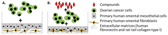 - Kenny, H.A.; Krausz, T.; Yamada, S.D.; Lengyel, E. Use of a novel 3d culture model to elucidate the role of mesothelial cells, fibroblasts and extra-cellular matrices on adhesion and invasion of ovarian cancer cells to the omentum. Int. J. Cancer 2007, 121, 1463–1472. [Google Scholar] [CrossRef] [PubMed]