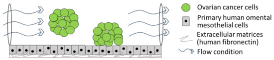 Peritoneal dissemination of ovarian cancer spheroids and their interactions with omental mesothelial cells are not static processes. Hydrodynamic forces generated by increased production of fluid in the peritoneal cavity must be considered in addition to the 3D culture itself. To recreate this aspect of the ovarian cancer TME, Li et al. developed a 3D microfluidic-based platform in which living cells are infused into micrometer-sized chambers [15]. These platforms enable accurate control of the cellular microenvironment, allowing a continuous release of growth factors or nutrients. In their device, Li et al. plated mesothelial cells on fibronectin, and added fluorescently labelled ovarian cancer spheroids under continuous fluidic flow to mimic the flow of peritoneal fluid induced by ovarian cancer in the clinical setting (Figure 3).