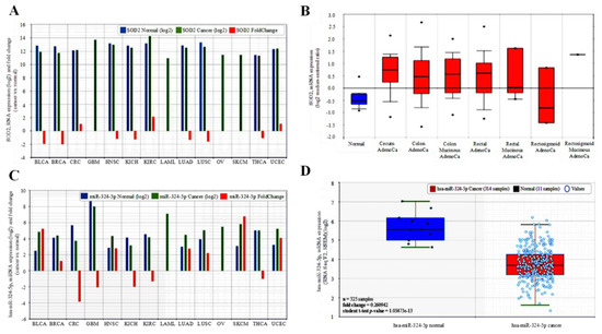 SOD2 is aberrantly expressed in malignancies and correlates with the suppression of hsa-miR-324 expression. (A) Comparative analyses of the SOD2 expression levels in normal–cancer tissue pairs of the TCGA 14 cancer types—pancancer cohort dataset using the starBase v2.0 software algorithms. (B) SOD2 is up-regulated in colon and rectal adenocarcinoma, CRC samples compared to normal samples (fold change = 1.05, student t-test p-value = 0.59432). (C) Comparative analyses of the hsa-miR-324-5p expression levels in normal–cancer tissue pairs of the TCGA 14 cancer type—pancancer cohort dataset. (D) Decreased levels of hsa-miR-324-5p in cancer compared to normal samples (fold change = 0.26, student t-test p-value = 1.035 × 10−13).