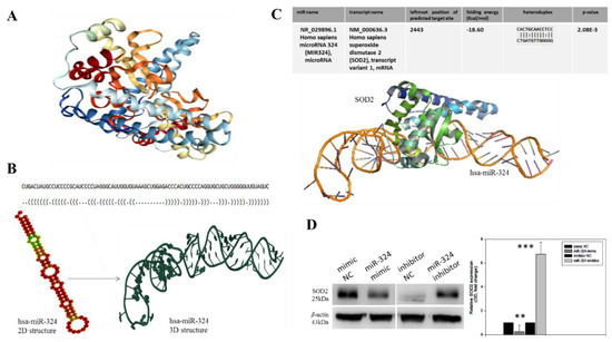 SOD2 interacts with, and is modulated by hsa-miR-324. (A) Crystal structure of the human manganese superoxide dismutase, PDB: 2ADQ. (B) The optimal secondary structure in dot-bracket notation with a minimum free energy (MFE) of −35.90 kcal/mol, (upper panel). The RNAfold-generated MFE secondary folding structure pattern of hsa-miR-324 (lower panel, left). The hsa-miR-342 tertiary structure generated based on the secondary structure in dot-bracket notation (lower panel, right). (C) Molecular docking showing the direct interaction between SOD2 and hsa-miR-324 with a shape complementarity/docking score of 14,236, Atomic contact energy (ACE) of −33.40 and an approximate SOD2-hsa-miR-324 complex interface area of 1896.30, using a root mean square distance (RMSD) of 9 for the final docking. The 3D transformation data, consisting of three rotational angles (38.44°, 20.02°, 216.62°) and three translational parameters (−0.02, 0.94, −1.95) applied on the ligand molecule, hsa-miR-324. (D) Representative Western blot image (left panel) and quantitative graphical representation (right panel) of the effect of variations in hsa-miR-324 expression on the expression level of SOD2 protein. β-actin served as loading control. NC, negative control; OD, optical density; * p < 0.05, ** p < 0.01, *** p < 0.001.
