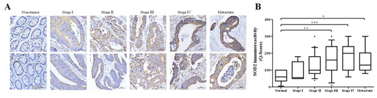 In humans, superoxide dismutases (SODs), with three subtypes, namely SOD1/ Cu,Zn-SOD, SOD2/Mn-SOD, and SOD3/extracellular SOD, constitute a principal component of the antioxidant defense system, and are also known as the antioxidases. SOD2 is a 96 kDa homotetramer nuclear-encoded mitochondrial manganese (Mn)-containing antioxidant enzyme. Through its interaction with, and binding to superoxide byproducts of oxidative phosphorylation, SOD2 is able to convert them into diatomic oxygen and hydrogen peroxide (H2O2). The Mn at the SOD2 active site catalyzes this disproportionization of superoxide anion to oxygen and H2O2, akin to SOD1 and SOD3 [12]. Despite documented association between mutations in the SOD2 gene and several pathologies, including sporadic motor neuron disease, idiopathic dilated cardiomyopathy (IDC), premature aging (progeria), and cancer, the role of SOD2 in cancer cells, such as in CRC cells, is not fully understood. While there are divergent views on the actual role of SOD2 in cancer, there is growing evidence that the loss of SOD2 function may not facilitate metastatic disease progression as previously thought; rather, there is an indication from experimental and epidemiological studies that enhanced SOD2 expression levels correlate with metastatic malignantization and disease progression in various cancer types [13]. It has been shown that the up-regulation of SOD2 protein expression is characteristic of certain cancers, including cervical and salivary adenoid cystic carcinoma [14,15].