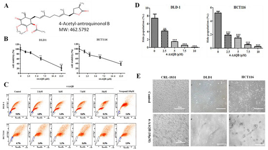 4-acetylantroquinonol B (4-AAQB) inhibits the viability and/or proliferation of human colorectal carcinoma side population cells. (A) The chemical structure of 4-acetylantroquinonol B (C26H38O7) with a molecular weight of 462.6 g/mol. (B) The inhibitory effect of 4-AAQB on the viability of DLD-1 (left panel) and HCT116 (right panel) colorectal cancer cell lines, using the sulforhodamine B (SRB) cytotoxicity assay. (C) Representative flow-cytometry dot plots of the dose-dependent attenuation of DLD-1 (upper panel) and HCT116 (lower panel) colorectal cancer side population cells by 4-AAQB, quantified by fluorescence-activated cell sorting (FACS) analysis. Control, cells were incubated in Hoechst 33342 alone (serving as negative control); Verapamil, cells with Hoechst 33342 accumulation in the presence of 100 μM verapamil (serving as positive control); 4-AAQB, cells with Hoechst 33342 accumulation in the presence of 2.5 μM–10 μM 4-AAQB. (D) Graphical representation of C. (E) Photomicrograph showing the morphological and quantitative changes in cultured 4-AAQB-treated CRL-1831 non-tumor colon cells, DLD-1 and HCT116 colorectal cancer side-population (SP) cells, compared to their untreated control counterparts.