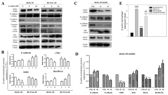 The anticancer effect of 4-AAQB is mediated by hsa-miR-324 and this is consistent with EMT- and cell-death-related molecular changes in colorectal cancer SP cells. (A) 4-AAQB down-regulates N-cadherin, vimentin, C-myc, SOD2, and Bcl-xl, but up-regulates E-cadherin and Bax. (B) Semi-quantitative analyses of E-cadherin, N-cadherin, SOD2, and the ratio of Bax and Bcl-xl protein expression in DLD1 and HCT116 cells treated with 4-AAQB. (C) SOD2 small interfering RNA (siRNA) knockdown DLD1 shows down-regulation of N-cadherin, with up-regulation of E-cadherin and Bax. (D) Semi-quantitative analyses of E-cadherin, N-cadherin, SOD2, Bax, Bcl-xl, and the ratio of Bax and Bcl-xl transcript expression in the siSOD2 DLD1 cell line by RT-PCR. * p < 0.05, ** p < 0.01, *** p < 0.001. (E) Graphical representation of the effect of 10 μM 4-AAQB treatment on SOD2 mRNA and hsa-miR-324 expression levels in DLD1 SP cells evaluated by RT-PCR. Statistical significance is indicated using * for CTL vs. 4-AAQB, and δ for hsa-miR-324 vs. SOD2. δδp < 0.01, *** p < 0.001; SP, side population cells; #1, siSOD2 clone 1; #2, siSOD2 clone 2.