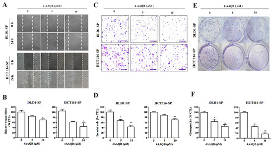 Having established that 4-AAQB effectively elicits the up-regulation of hsa-miR-324 while down-regulating SOD2 expression, we further investigated the effect of 4-AAQB treatment on the motility and oncogenicity of CRC-SCs using the sorted DLD-1 or HCT116 SP cells. We demonstrated that compared to the observed migration by the untreated cells, exposure to 5–10 μM 4-AAQB significantly attenuates the ability of the SP cells to migrate in a dose-dependent manner over a 24 h time-course (Figure 6A). At the 24 h time-point, the DLD-1 SP cells treated with 5–10 μM 4-AAQB had lost ~20–29% migratory potential, while the HCT116 SP cells recorded a 41–59% lag in migration, in comparison to observed migration by their untreated counterparts (Figure 6B). Similarly, 4-AAQB treatment elicited a significant reduction in the number of invaded DLD-1 SP (5 μM: 35%, p < 0.05; 10 μM: 60%, p < 0.01) or HCT116 SP (5 μM: 11%, p = non-significant; 10 μM: 31%, p < 0.01) cells (Figure 6C,D). Moreover, we observed that there was a significantly attenuated capacity to form colonies in the 4-AAQB-treated SP cells, in comparison to the untreated SP cells (Figure 6E,F). These results indicate that 4-AAQB effectively inhibits the SOD2-mediated motility, invasiveness, and the clonogenicity of CRC-SC cells.