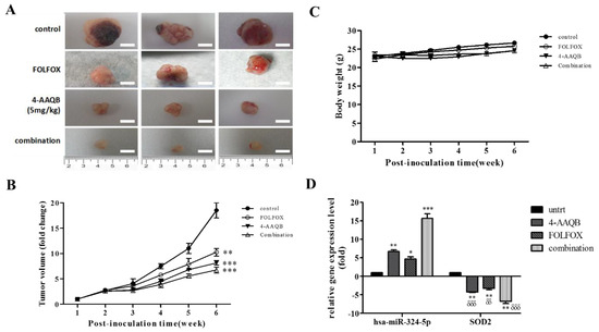 Since our team is practice-oriented, we pre-clinically probed for the translational relevance of our in vitro findings by assessing the in vivo effect of 4-AAQB and/or FOLFOX (folinate (leucovorin), fluorouracil (5FU), and oxaliplatin) on the growth of CRC cells in the BALB/c mice (average body weight, 22.5 ± 3.74 g) xenograft model. Results of our tumor xenograft assays showed that by end of week 6, the tumors grown in mice inoculated with untreated DLD-1 cells (n = 5) were numerically more and much larger than those in mice treated with FOLFOX (n = 5, p < 0.01), 4-AAQB (n = 5, p < 0.001) or a combination of 4-AAQB and FOLFOX (n = 5, p < 0.001), in descending order of degree (Figure 8A,B). Macro-anatomically, the average weights of the tumors that were resected from the 4-AAQB- and combination-treated mice were significantly lesser than that of the FOLFOX- treated or untreated control mice (4-AAQB vs. control: 334.3 ± 79.4 mg vs. 3674.1 ± 593.1 mg, p < 0.001; Combination vs. control: 282.6 ± 46.8 mg vs. 3674.1 ± 593.1 mg, p < 0.001; FOLFOX vs. control: 459.3 ± 57.9 mg vs. 3674.1 ± 593.1 mg, p < 0.01) (Figure 8A,B), indicating that the xenograft tumor growth was significantly inhibited by 4-AAQB alone or in combination with FOLFOX, compared with the FOLFOX- treated or untreated group. Additionally, while the mean body weight of 4-AAQB- or dual agent- treated tumor-inoculated mice was stable, we observed a slight increase (~2 g) in those treated with FOLFOX, as well as in the untreated control group (~4 g) by end of week 6 (Figure 8C). The observed increase in body mass in the untreated and FOLFOX-treated littermates were however, statistically insignificant, and all mice (n = 5/treatment regimen) exhibited normal feeding habits and motor activity. Finally, and interestingly, we demonstrated robust reciprocity in the differential expression of SOD2 and hsa-miR-324-5p in the tumors resected from the xenograft mice in all treatment groups, using RT-PCR (Figure 8D). We observed statistically significant moderate (p < 0.01), mild (p < 0.05), or strong (p < 0.001) increase in the expression of hsa-miR-324-5p in mice treated with 4-AAQB alone, FOLFOX alone, or 4-AAQB + FOLFOX combination, respectively (Figure 8D). Those results indicate that 4-AAQB is non-toxic to non-cancerous tissues (also see Supplementary Figure S2), and that alone or in synergism with FOLFOX, 4-AAQB significantly inhibits CRC xenograft tumor growth in vivo.