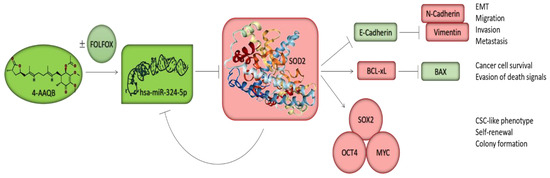 A pictorial summary of the anticancer therapeutic activity of 4-AAQB, alone or in combination with FOLFOX against CSCs in CRC cells. 4-AAQB inhibits the aberrant expression of SOD2 through the re-expression of hsa-miR-324-5p, the negative modulation of pluripotency transcription factors, the augmentation of the BAX/BCL-xL ratio, and the reprogramming of malignant colorectal cancer cells from the aggressive mesenchymal phenotype to a relatively benign epithelial phenotype, subsequently enhancing the sensitivity of the cancer cells to conventional chemotherapy and facilitating better prognosis.