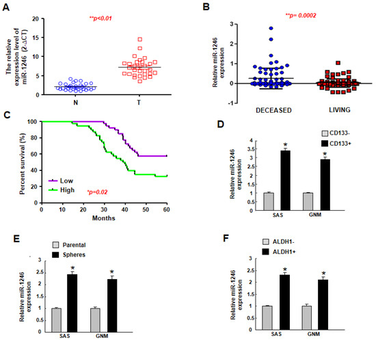 To determine the relative expression of miR-1246 in oral carcinomas, the normal and tumor tissues were subjected to real-time qRT-PCR. As shown in Figure 1A, the expression level of miR-1246 in tumor tissues was upregulated. In associated with this result, a higher expression of miR-1246 was observed in the deceased patients compared to living ones using TCGA dataset (Figure 1B). Upregulated miR-1246 is correlated with poor survival outcome of OSCC patients (Figure 1C). As shown in Table 1, up-regulation of miR-1246 was highly correlated with T category, stage, and lymph node metastasis of OSCC (* p < 0.05). No significant difference in miR-1246 expression was observed with respect to other factors, such as age, sex, and differentiation status (p > 0.05). CD133+ [24], sphere-forming [25], and ALDH1+ [26] cells are considered oral cancer stem cells, and our results showed that the expression of miR-1246 was consistently increased in these cells (Figure 1D–F) using two oral cancer cell lines (SAS and GNM). These results suggested that the elevated expression of miR-1246 may be associated with cancer aggressiveness.
