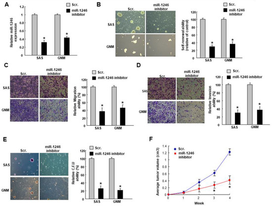 Inhibition of miR-1246 downregulates the stemness phenotypes in OSCC. (A) Cells were transfected with miR-1246 inhibitors followed by an examination of the relative expression of miR-1246; (B) Self-renewal, (C) migration, (D) invasion, (E) colony formation properties were evaluated (100×); (F) Subcutaneous xenografts in mice was carried out to assess the in vivo tumorigenicity. Experiments were repeated three times and representative results were shown. Results are means ± SD of triplicate samples from three experiments. * p < 0.05.