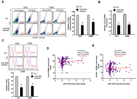 Downregulation of miR-1246 reduces the CSC markers in OSCC cells. (A) The ALDH1 expression was analyzed by flow cytometry and (B) the relative expression of Sox2 was examined by RT-PCR analysis; (C) Percentage of CD44+ cells were assessed by flow cytometry; Positive relationships between miR-1246 and stemness markers, Sox2 (D) and ALDH1 (E) were shown. * p < 0.05.